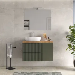 Mobile bagno sospeso 90 cm due cassetti verde selva effetto cannettato con anta e top rovere gold con specchio - Lameck