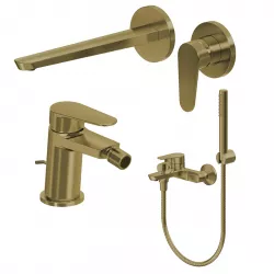 Set miscelatore lavabo a muro canna 25 cm e bidet con scarico con esterno vasca oro spazzolato – Lir